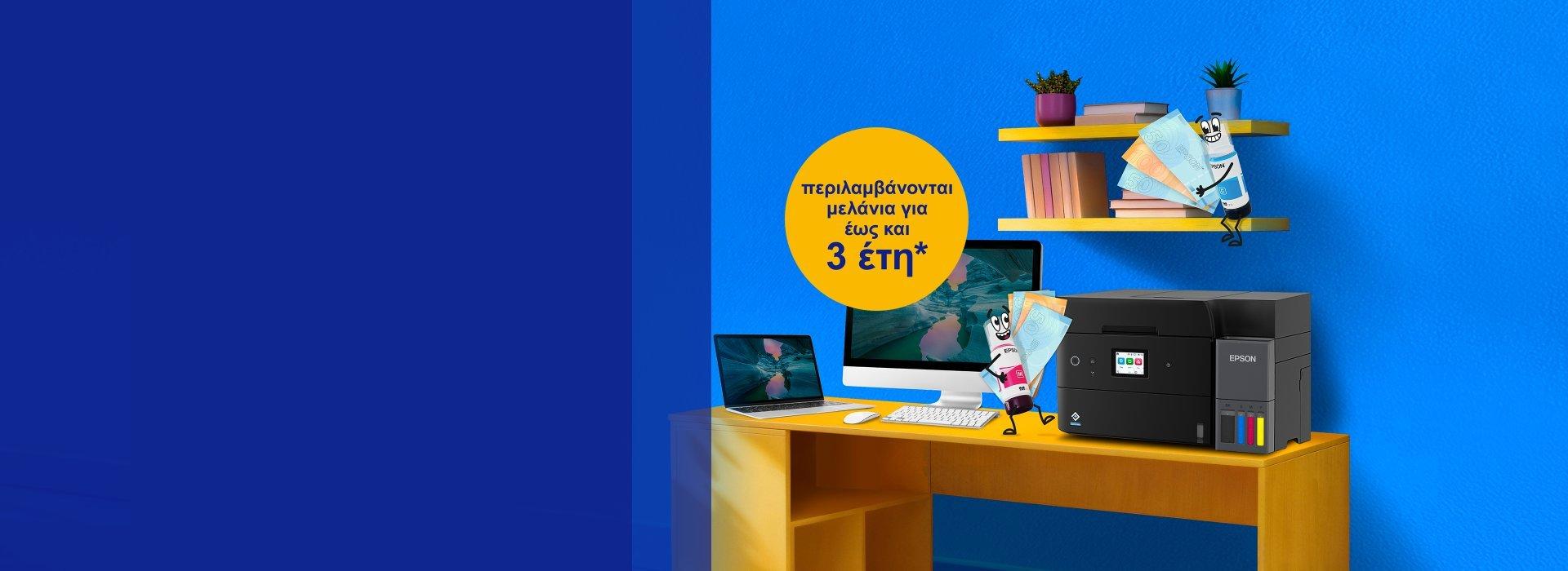 * Ισχύουν οι πλήρεις όροι και προϋποθέσεις. Για τα μελάνια για εκτυπώσεις 3 ετών που περιλαμβάνονται στη συσκευασία αγοράς, ανατρέξτε στο epson.gr/ecotankfootnotes